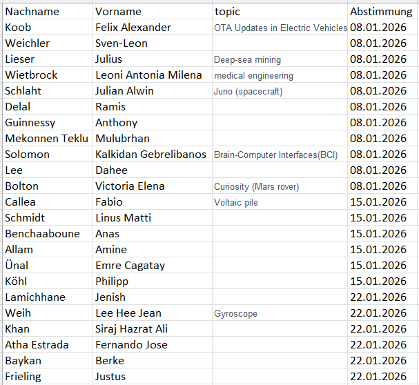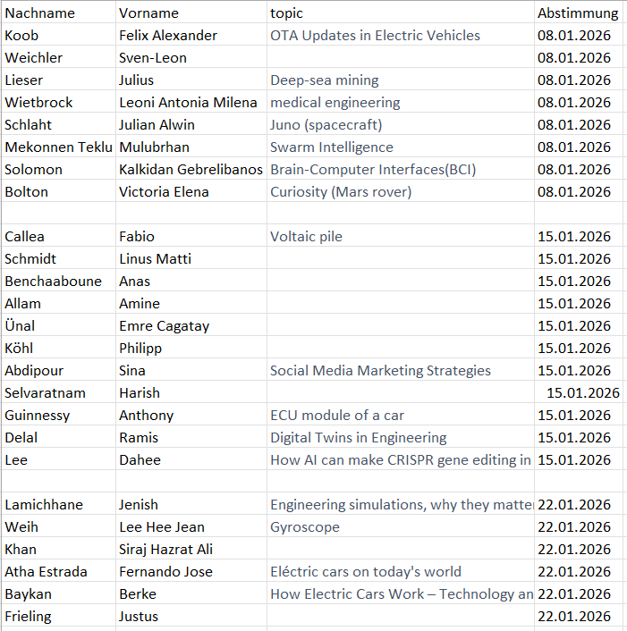 presentation schedule von Ulrike Friedrich - Dienstag, 23. Dezember 2025, 14:56 Anzahl Antworten: 1 Dear all,This is our presentation schedule:Merry Christmas!Ulrike Friedrich Dauerlink Als Antwort auf Ulrike Friedrich Re: presentation schedule von Ulrike Friedrich - Mittwoch, 7. Januar 2026, 11:14 Dear all,Happy new year to all of you!This is the adapted schedule of our presentations: Dauerlink Ursprungsbeitrag