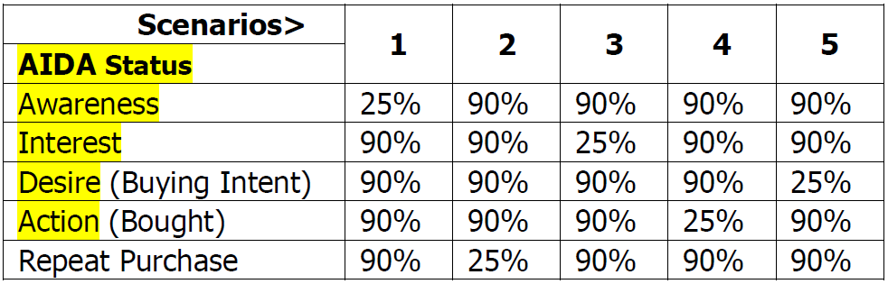 Reading example for Scenario 1: 25% are aware of the product, out of the 25% 90% have an interest,